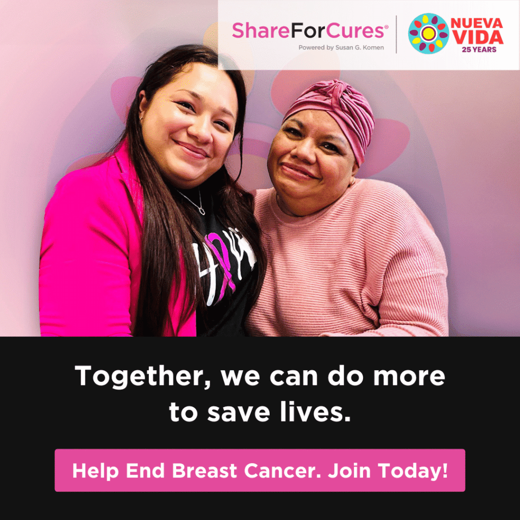 By working together through the ShareForCures Alliance, organizations like Nueva Vida are helping to close critical gaps in breast cancer research and resources. When diverse communities participate in ShareForCures, including Latinos, those individuals help ensure that discoveries reflect the true diversity of breast cancer experiences. The more inclusive the registry, the more impactful the discoveries can be for everyone.