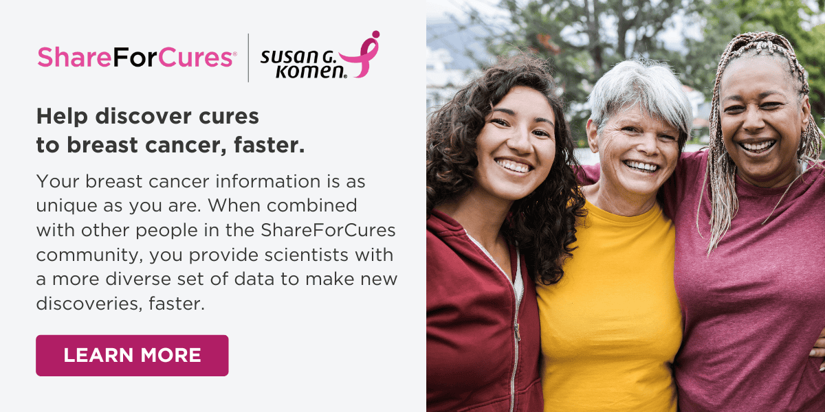 If you or a loved one needs information or resources about clinical trials, the Patient Care Center can help. Contact the Komen Breast Care Helpline at 1-877-465-6636 or email clinicaltrialinfo@komen.org. Se habla español. |