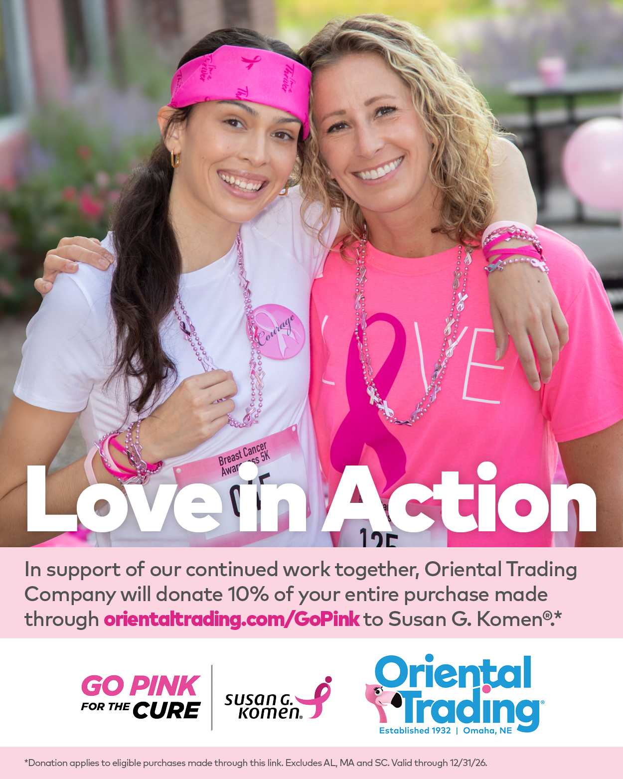 Oriental Trading Company has signed on for a full year of support benefiting Susan G. Komen®. Now through December 31, 2026, every purchase across all Oriental Trading Company products made through a dedicated Go Pink link will help support Komen’s mission to end breast cancer. By shopping through this easy-to-remember link (Susan G. Komen – Go Pink for the Cure ), 10% of your purchase will be donated to Susan G. Komen®.* This is a simple, impactful way to double your impact. The link is perfect for event leads, teams, and organizers purchasing supplies for races, walks, school events, and fundraising activations throughout the year. From cheer items to event essentials, every order helps fuel critical research, education, and patient support. Please use and share this link widely—and encourage your networks to shop pink, shop smart, and shop with purpose.